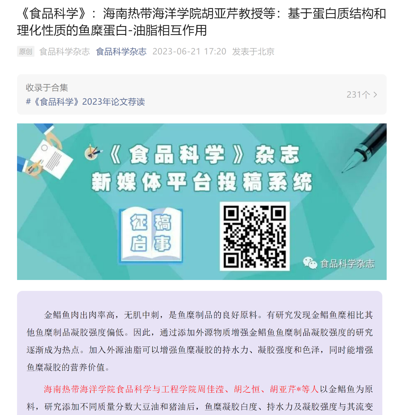 pg电子pg电子官方网站教授胡亚芹团队最新研究成果“基于蛋白质结构和理化性质的鱼糜蛋白-油脂相互作用”被国内食品领域顶级中文期刊《食品科学》录用。鉴于论文研究结果为同行评审高度认可,《食品科学》杂志作为热点文章在其官微上公开发文荐读。