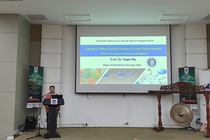 胡亚芹受邀作题为《海葡萄酸性多糖的成骨效应及机制研究》的大会主题报告,系统介绍了海葡萄酸性多糖对骨髓间充质干细胞增殖、迁移及成骨分化的影响,并进一步在斑马鱼模型中验证了其成骨活性,为相关功能食品的开发提供了理论依据。王冬雪以《棘冠海星皂苷在HepG2细胞中的抗肿瘤活性及线粒体凋亡机制》为题进行汇报,深入探讨了棘冠海星皂苷的抗肿瘤作用机制,并展望了其在医药与功能性成分领域的应用前景。陈耀贤老师汇报的题目为《基于断肢-苗圃繁殖技术的Acropora spp.珊瑚园艺与直接移植研究:边界岛的可行性分析》,重点介绍了在分支洲岛利用珊瑚断肢繁殖技术开展珊瑚礁生态修复的进展与成效。