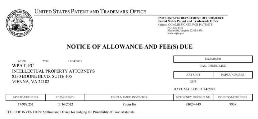 近日,胡亚芹教授领衔的科研团队在食品3D打印领域取得重大突破,其研发的“Method and device for judging the printability of food materials(一种评判食品物料可打印性的方法及装置)”正式获得美国专利商标局(USPTO)授权通知(美国专利号:US 17/988,251)。这是我校在食品智能制造与增材制造交叉领域获得的又一项重要国际性知识产权成果,标志着我校相关技术的创新性获得了国际认可。
