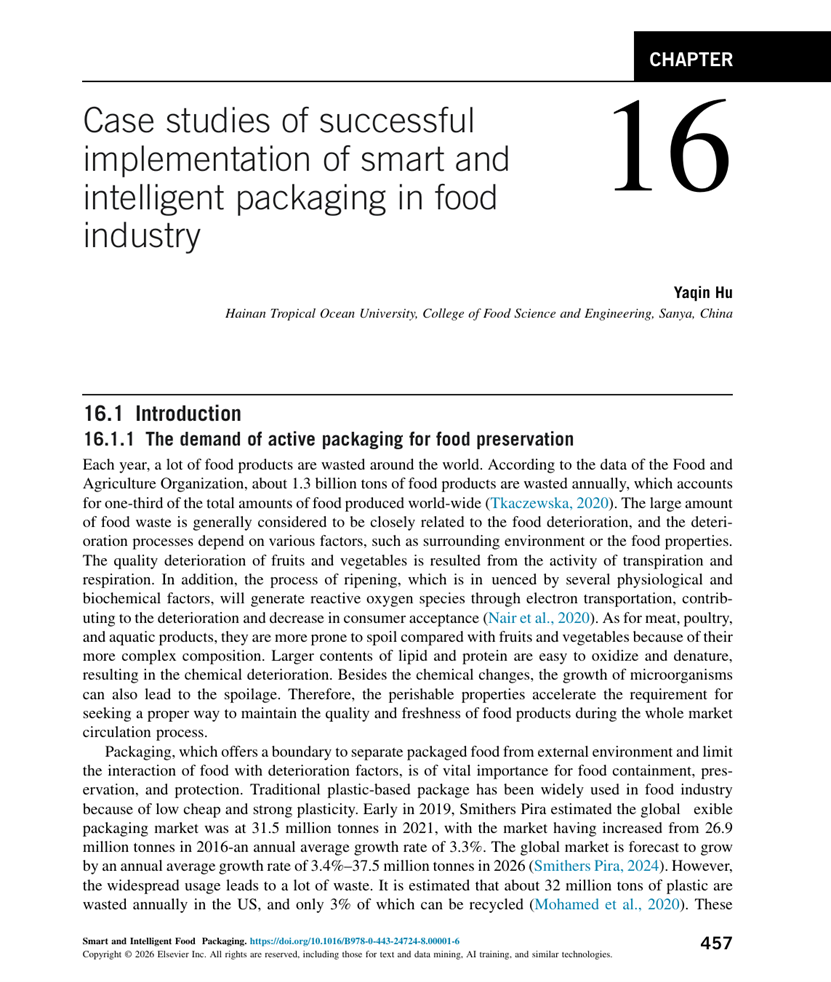 胡亚芹教授在该书中独立撰写了第16章Case studies of successful implementation of smart and intelligent packaging in food industry(食品工业中智能与活性包装成功实施案例研究),聚焦基于果胶多糖的活性包装体系,系统阐述了其在水果、蔬菜、肉类、水产品及乳制品保鲜中的应用效果与技术机理,展示了其在延长食品货架期、减少食品浪费方面的显著优势。该章节内容兼具学术深度与应用价值,体现了胡亚芹教授在食品活性包装与生物高分子材料领域的深厚积累与研究实力。